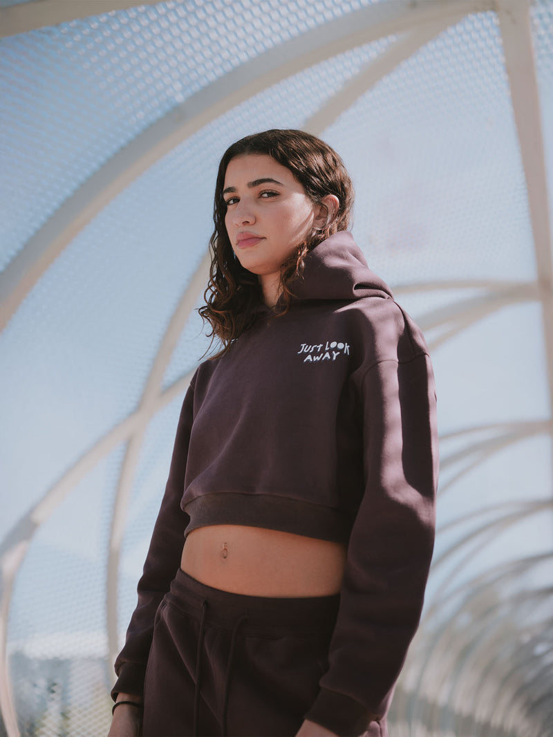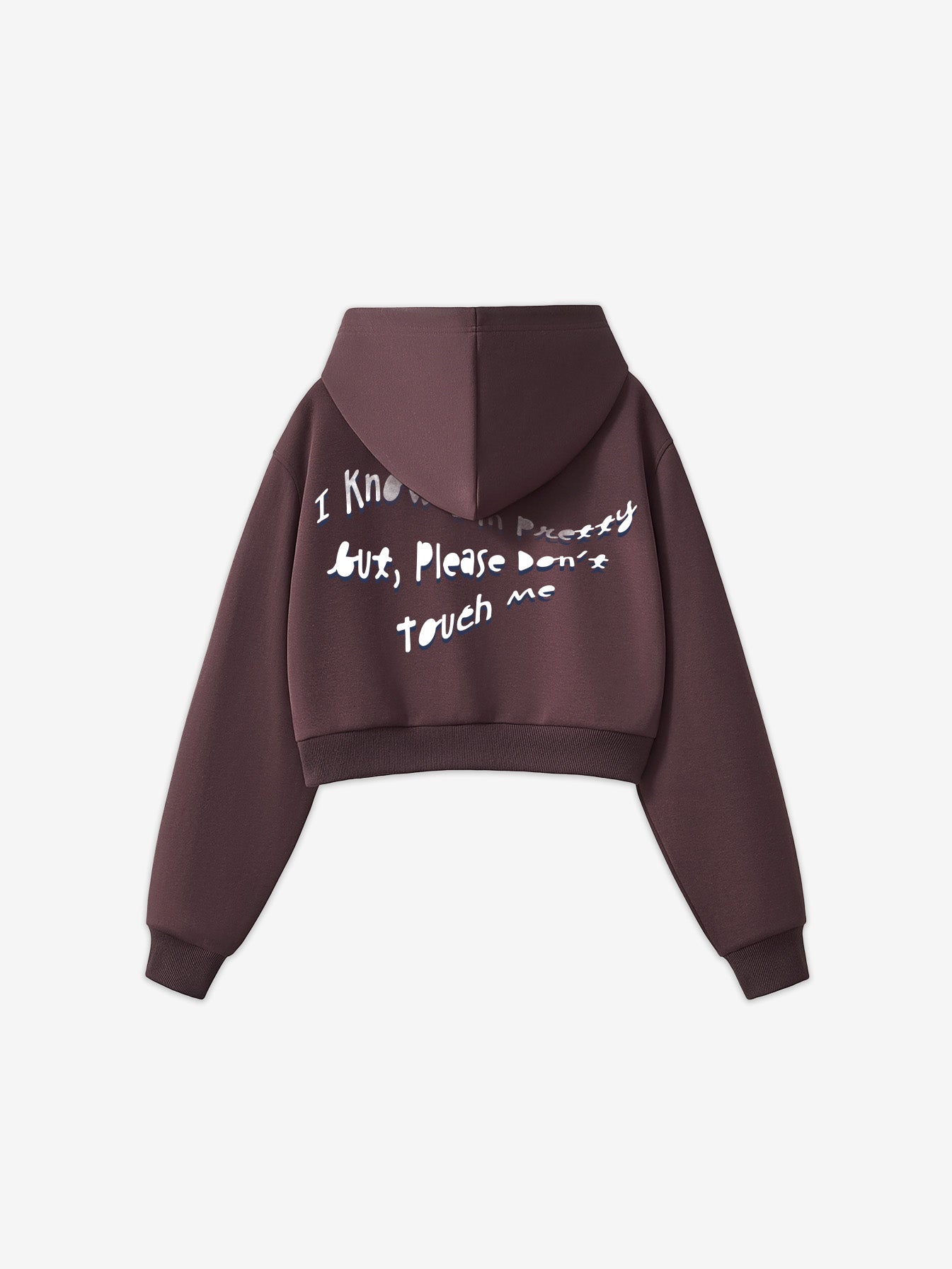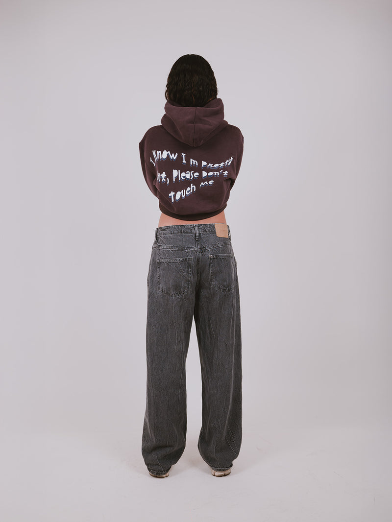 Just Look Away isn’t just a sweatshirt, it’s a statement. With raw-edge hems, a faded charcoal-blue wash, and bold white typography, this cropped piece delivers both softness and strength. The front quietly warns: "Just look away," while the back speaks louder, "I know I’m pretty but please don’t touch me."