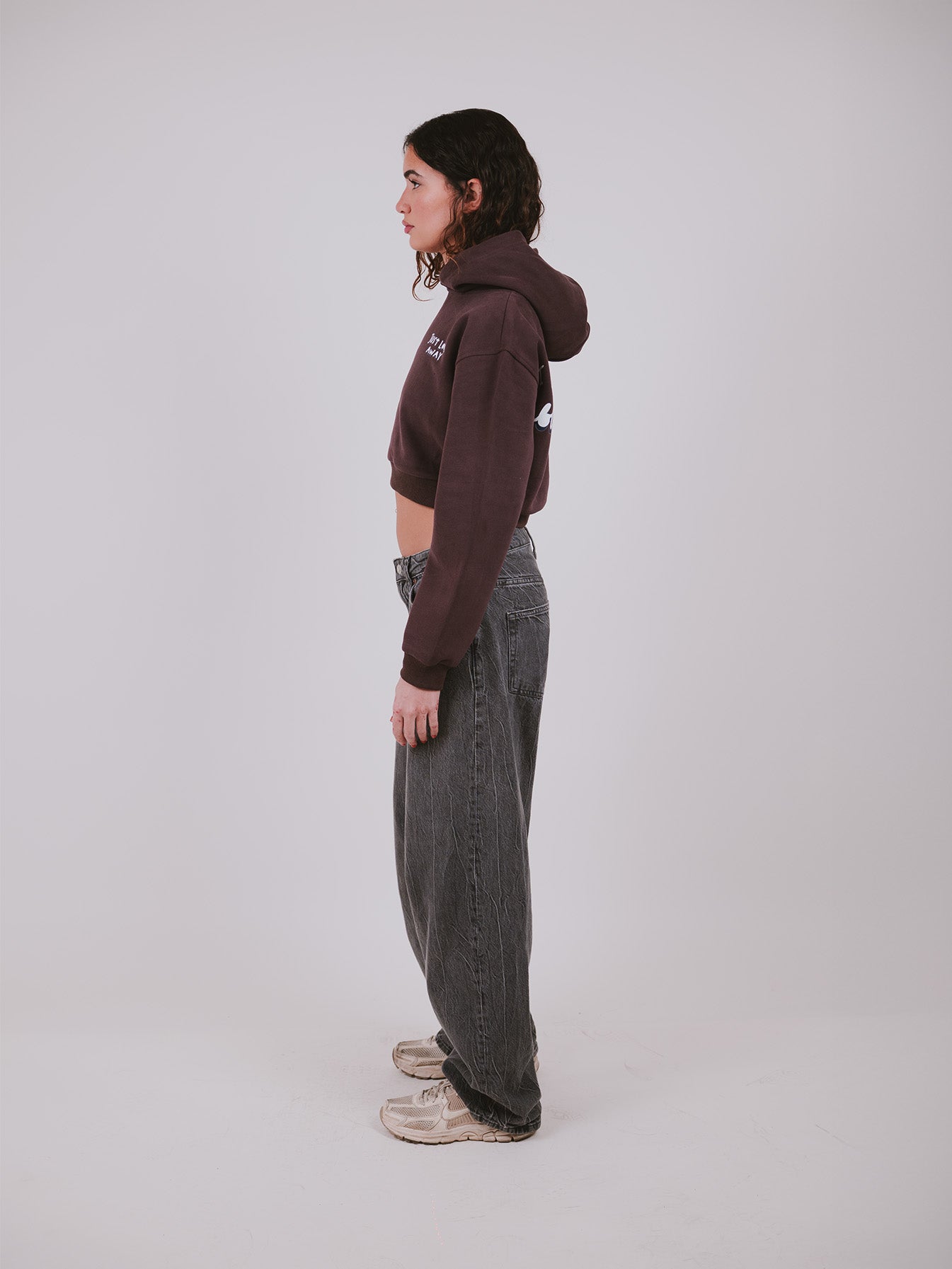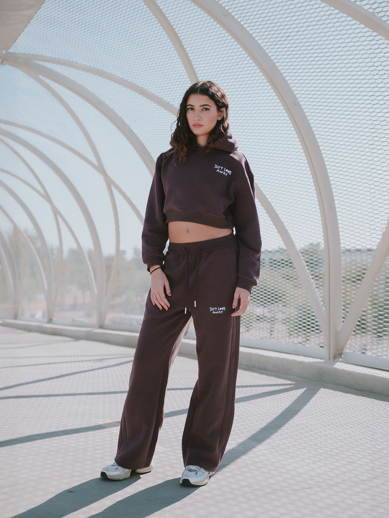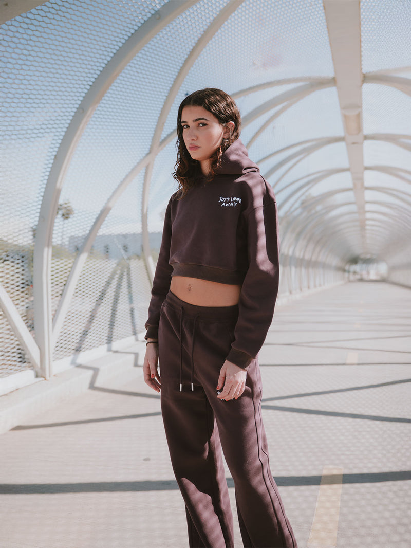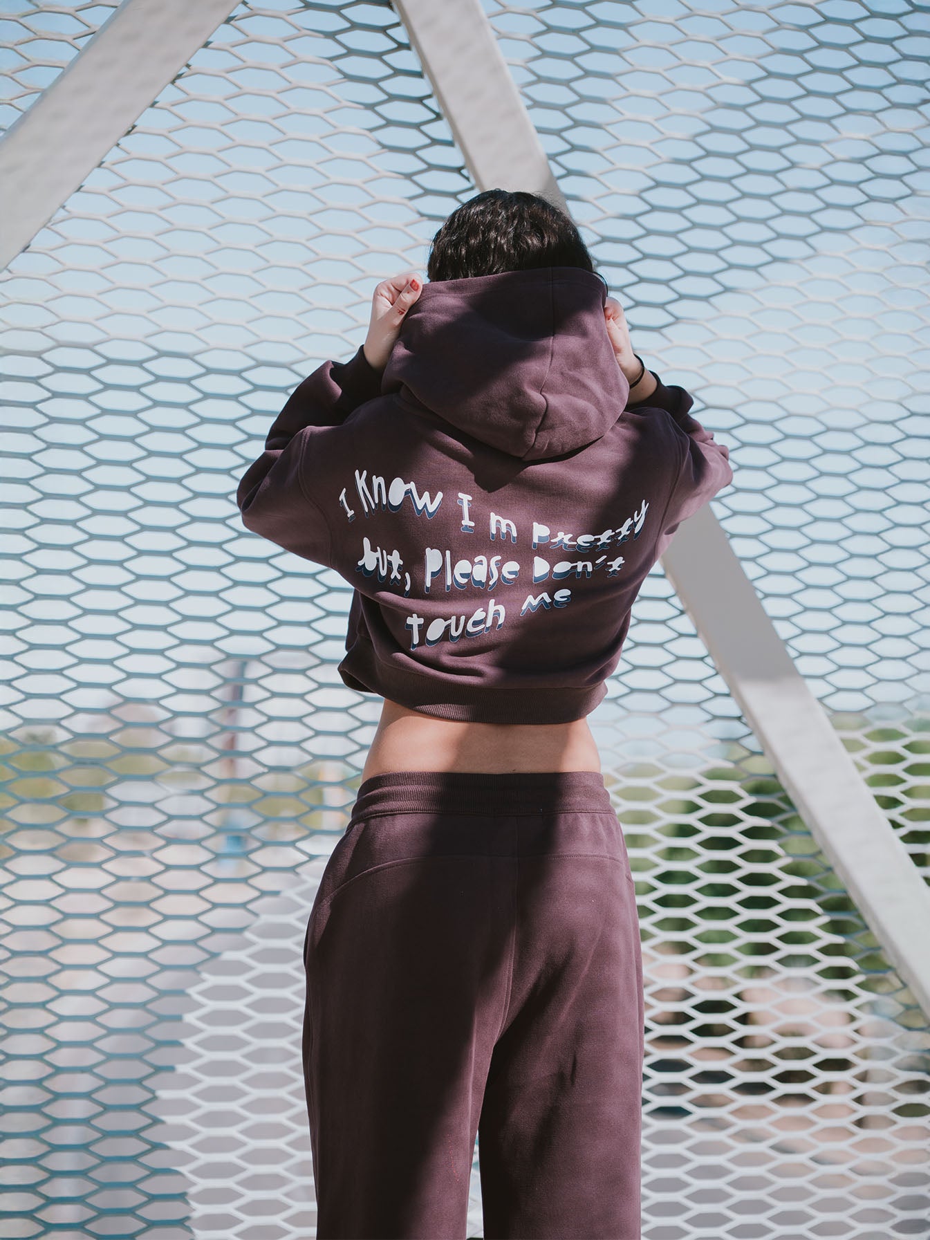 Just Look Away isn’t just a sweatshirt, it’s a statement. With raw-edge hems, a faded charcoal-blue wash, and bold white typography, this cropped piece delivers both softness and strength. The front quietly warns: "Just look away," while the back speaks louder, "I know I’m pretty but please don’t touch me."
