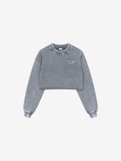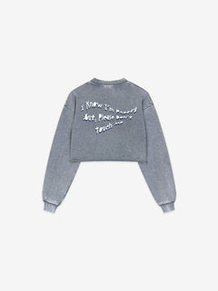 Just Look Away isn’t just a sweatshirt, it’s a statement. With raw-edge hems, a faded charcoal-blue wash, and bold white typography, this cropped piece delivers both softness and strength. The front quietly warns: "Just look away," while the back speaks louder, "I know I’m pretty but please don’t touch me."