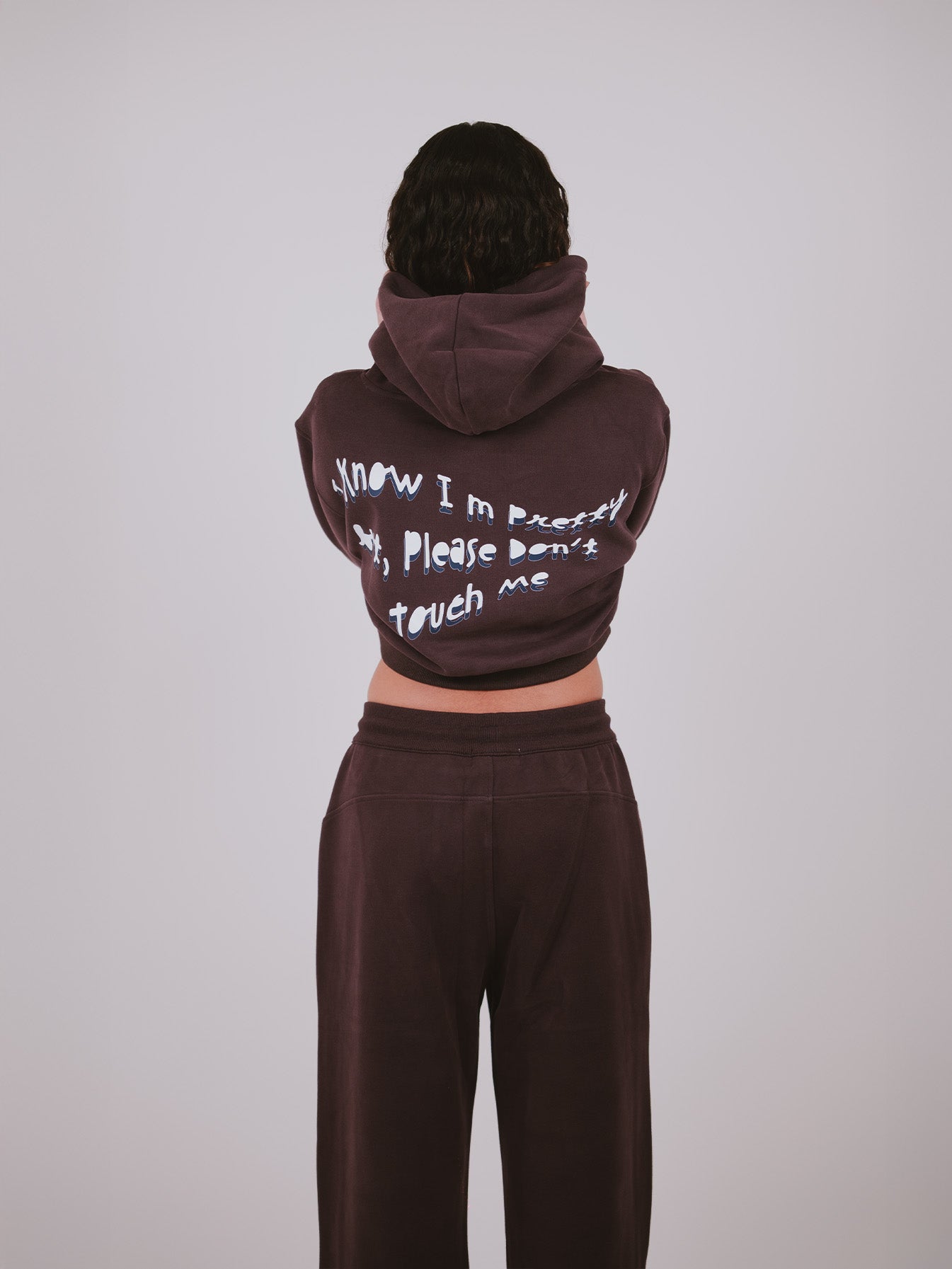 Just Look Away isn’t just a sweatpants, it’s a statement. With raw-edge hems, a faded charcoal-blue wash, and bold white typography, this cropped piece delivers both softness and strength. The front quietly warns: "Just look away," while the back speaks louder, "I know I’m pretty but please don’t touch me."